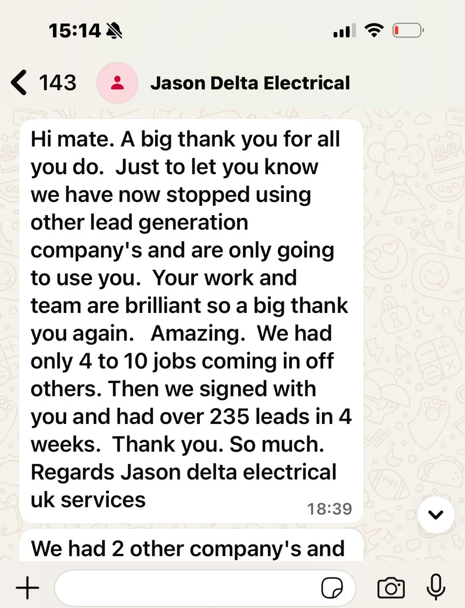 No Exceptions! We work exclusively with Electricians, no other industries, no distractions. We know exactly how to generate high-quality leads, booked jobs, and real revenue growth for Electrician businesses. Our strategies are built for electricians, by electrician marketing specialists.